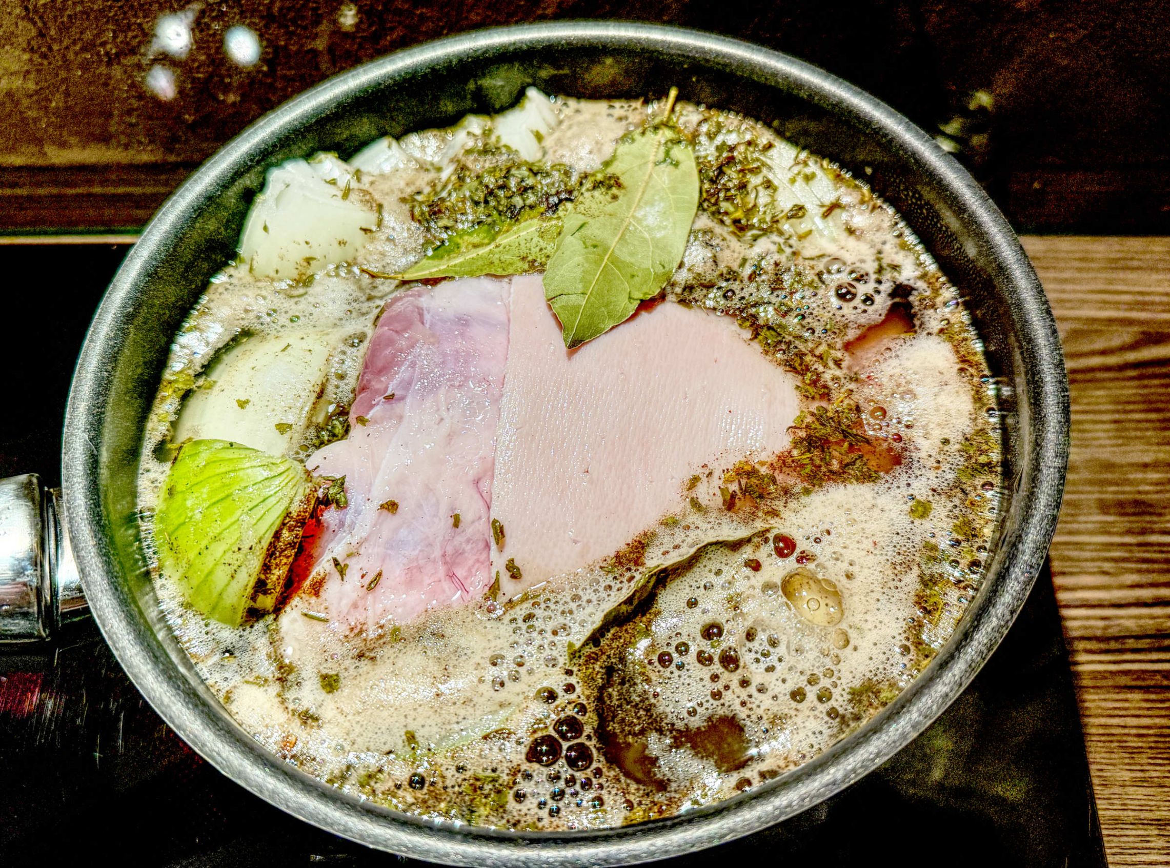 Die rosafarbene Haut mit einem scharfen Messer in kleine Karos gezeichnet kennt man sonst nur bei den Völkern, die im tiefsten Dschungel leben. Heute dürfen wir selbst Hand anlegen und das kleine Ferkelchen mit einer Klinge ritzen. Geduldig lässt sie die Prozedur über sich ergehen und gibt kein Laut von sich. Das nennt man wohl Hingabe. Bis sich die Kleine dann endgültig in voller Güte vor unseren Augen präsentiert Bedarf es noch weitere kleine Schritte der Vorbereitung. So zum Beispiel wird die Kleine ein wenig ca 90 Minuten lang in wohltemperiertem Wasser baden. Badezusätze dürfen nicht fehlen und so greifen wir neben Salz noch zu weiteren wertvollen Beilagen. Auch Lorbeerblätter und Zwiebeln kommen ins Badewasser.